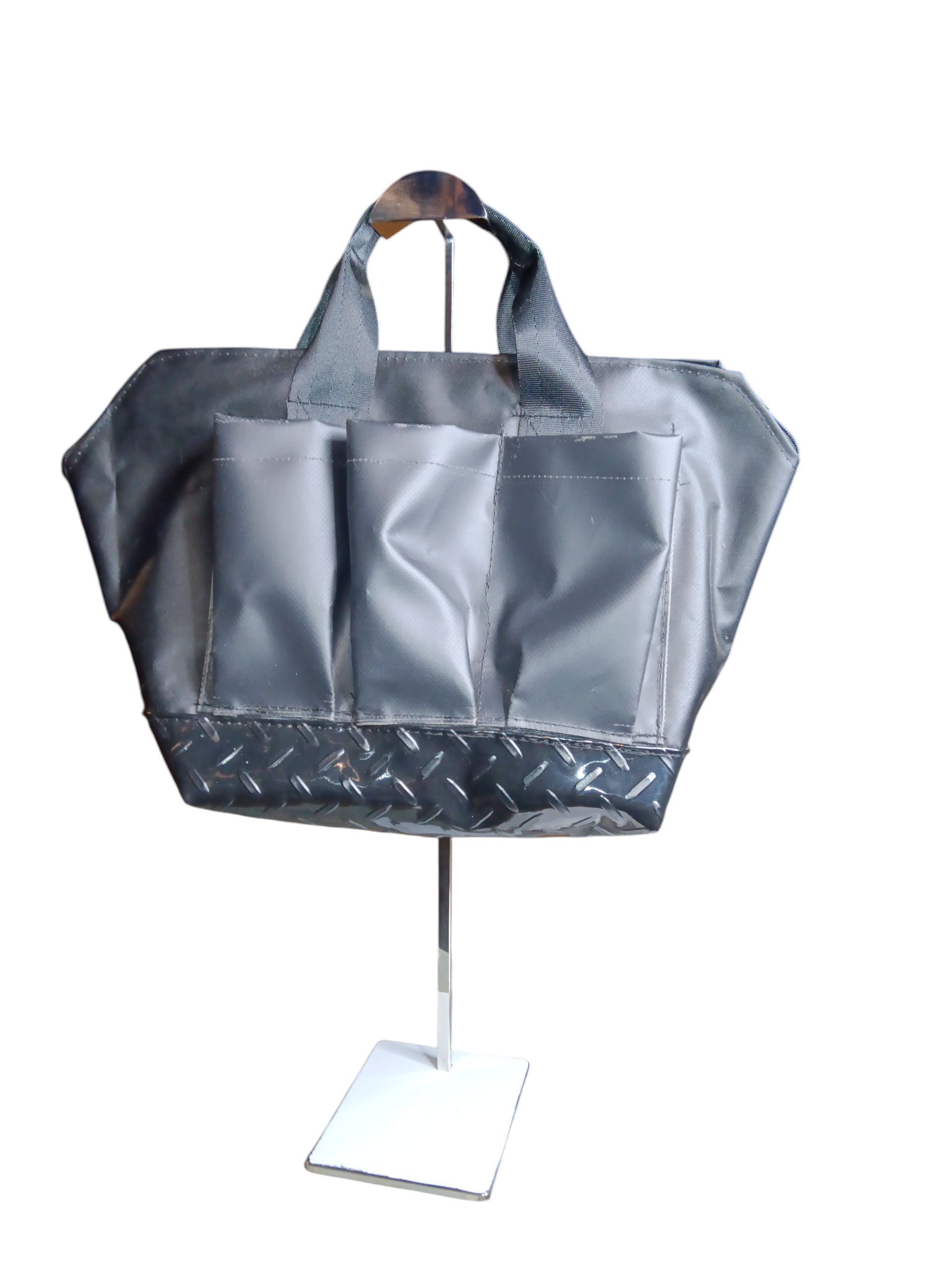 Black vinyl, diamond plated vinyl bottom Rolled handles for comfort external pocket and slots