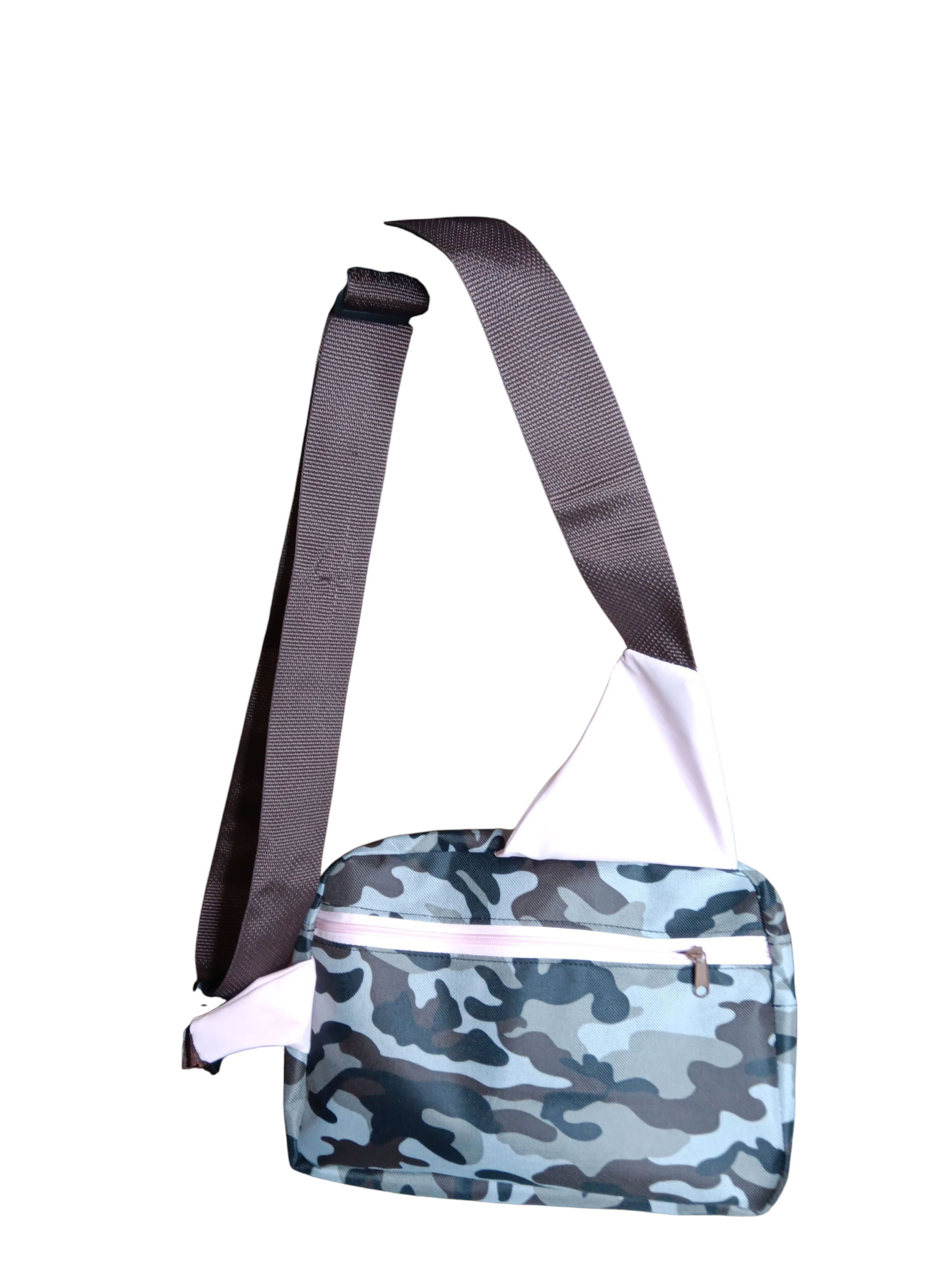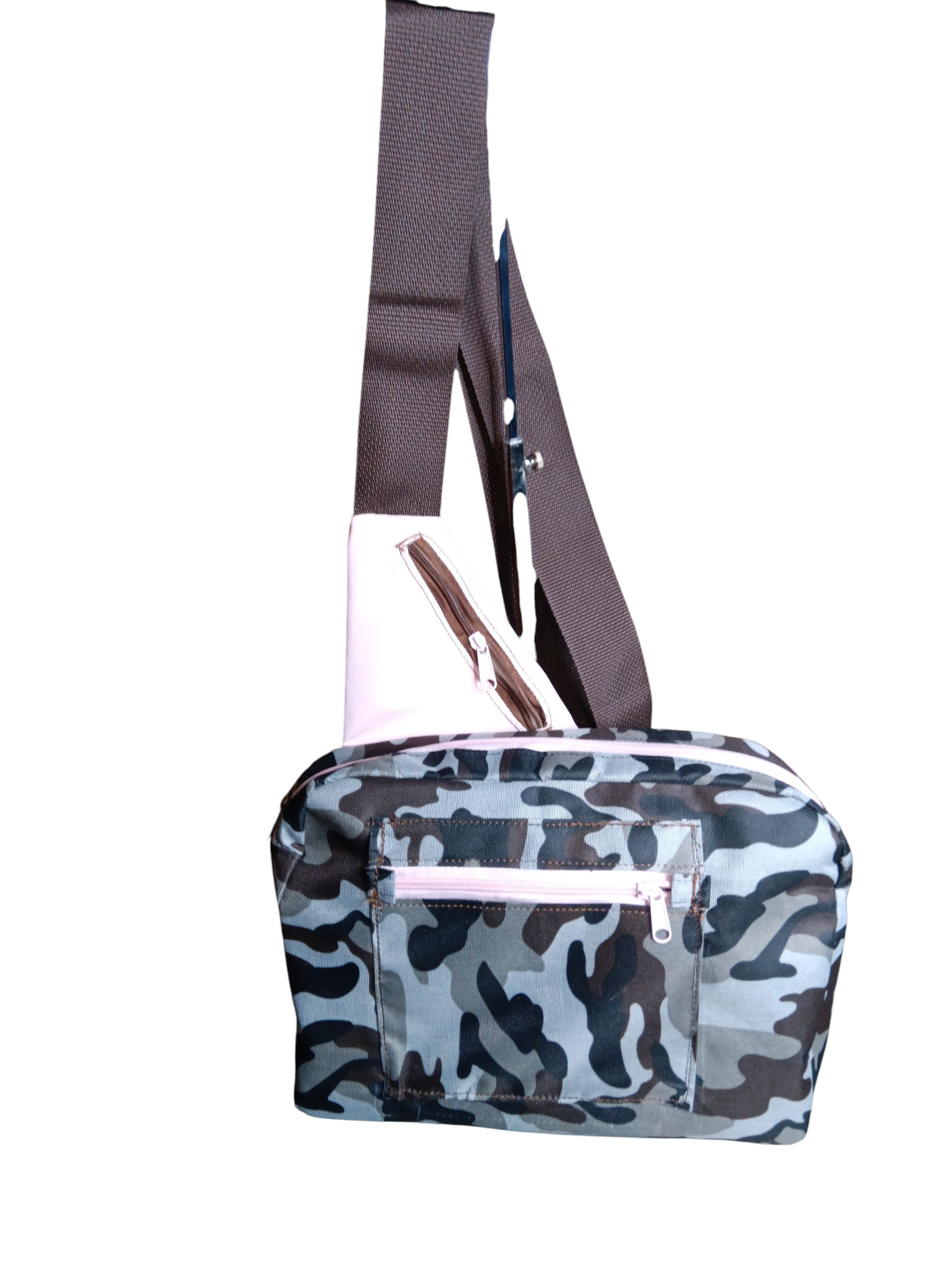 Brown camouflage and pink 1 inside pocket 2 external pockets pink zippers and zipper tape 12x8